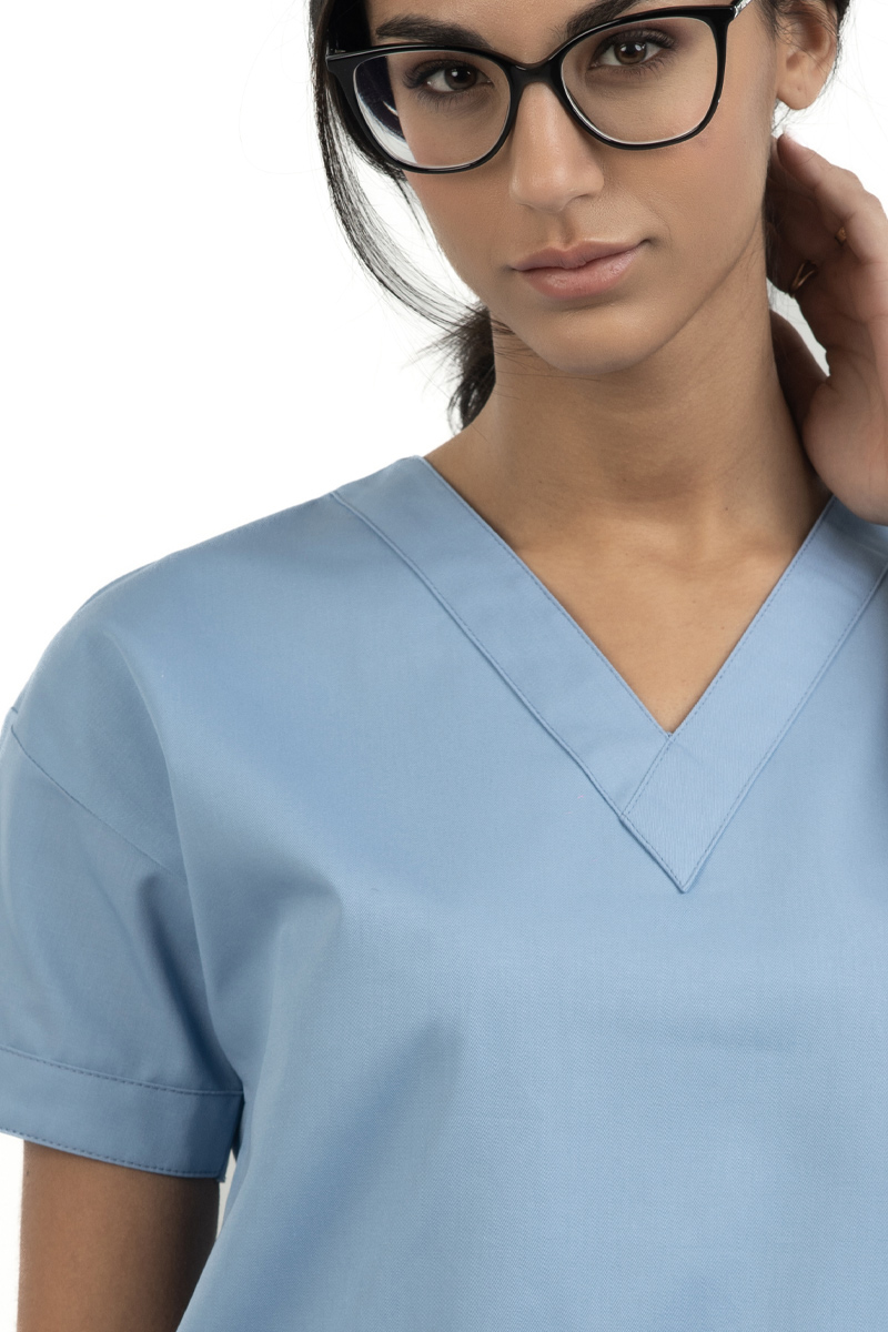 Casacca azzurro chiaro davvero confortevole e fresca. Il tessuto è morbido, traspirante e resistente ai lavaggi. Vestibilità unisex molto pratica, ideale per studi medici e dentistici. Colore luminoso e professionale.