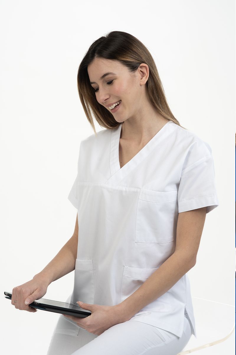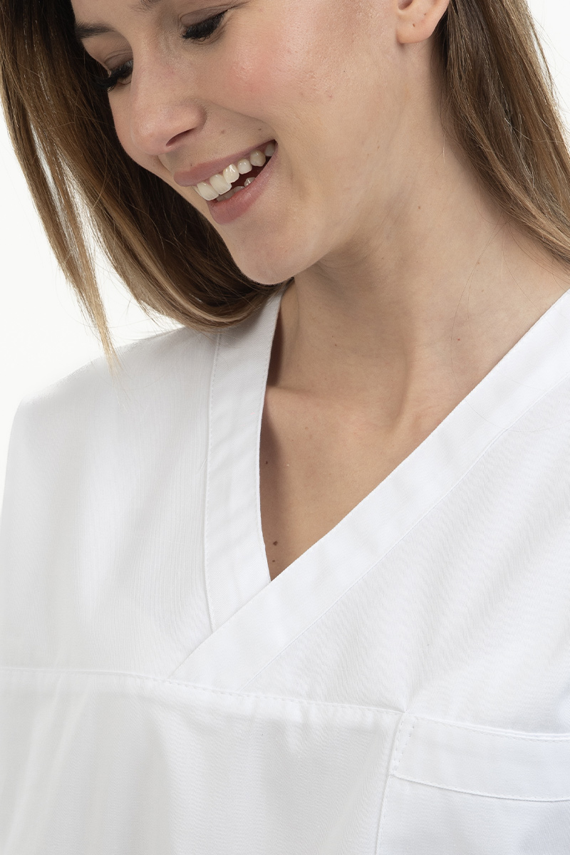 Casacca unisex con collo a V incrocio e manica a kimono, realizzata in 100% cotone, ideale per garantire massima traspirabilità e comfort durante tutto il turno di lavoro. Il collo a V incrociato, nel colore bianco, conferisce un tocco moderno e professionale, mentre la manica a kimono assicura libertà di movimento. Dotata di 2 ampie tasche frontali per avere sempre tutto a portata di mano, oltre a un taschino portabadge o porta scheda sul petto, indispensabile per il personale sanitario.