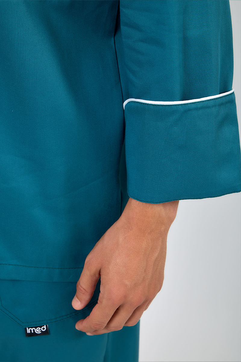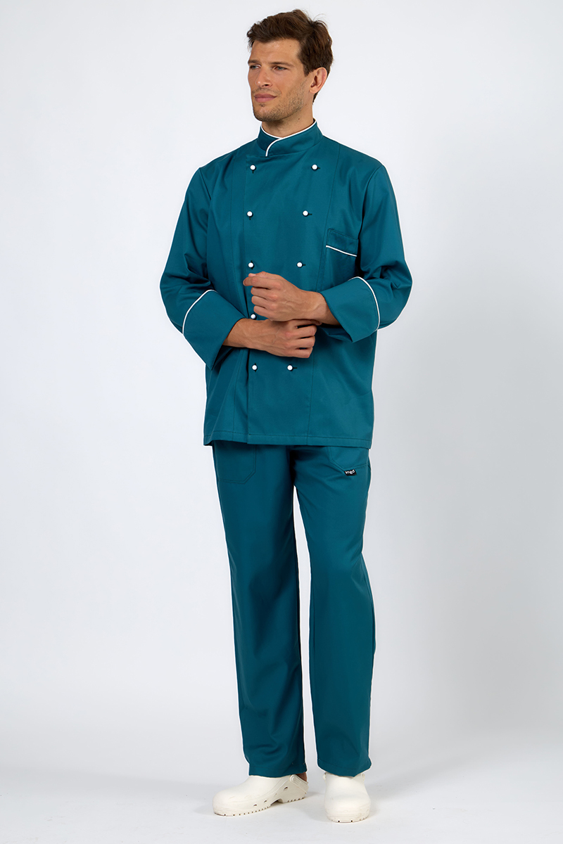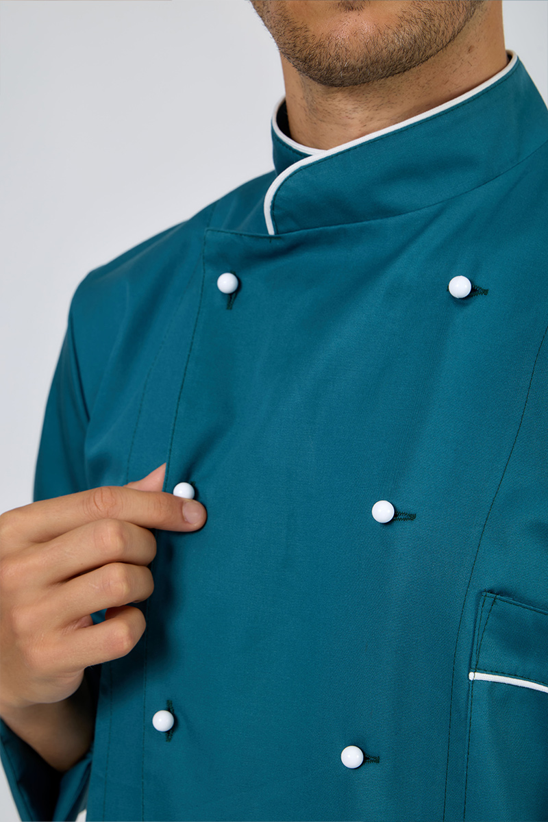 La giacca cuoco unisex colore petrolio è un capo professionale studiato per coniugare comfort, funzionalità ed eleganza in cucina. Realizzata in cotone 100%, assicura una traspirazione naturale e un’elevata resistenza ai lavaggi frequenti, mantenendo nel tempo la brillantezza del colore e la morbidezza del tessuto.