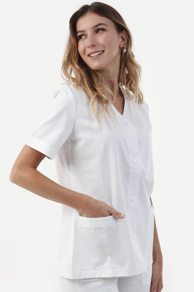 Casacca sanitaria donna con collo a V modello Eco, realizzata in cotone 100% naturale, progettata per garantire praticità e comfort durante le giornate di lavoro. Il modello Eco si distingue per il design essenziale e funzionale, senza bordi doppi, che assicura leggerezza e una linea pulita, ideale per un utilizzo quotidiano.