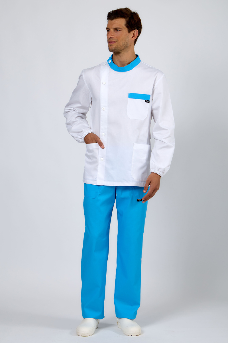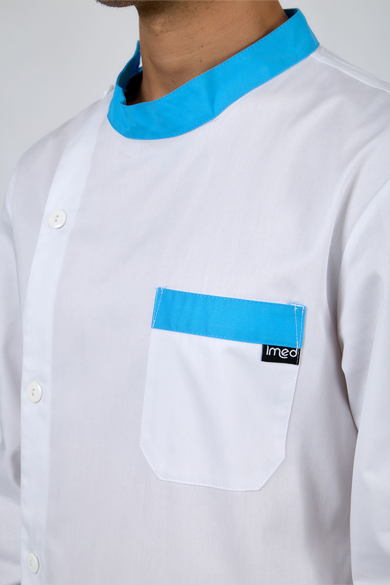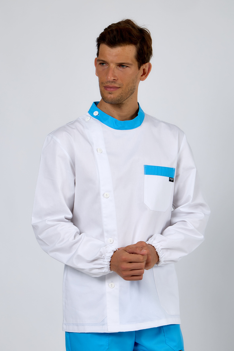 Realizzata in 100% cotone di alta qualità, nella versione bianca con bordi color atollo su collo e taschino, è ideale per medici, infermieri, OSS e tecnici sanitari.