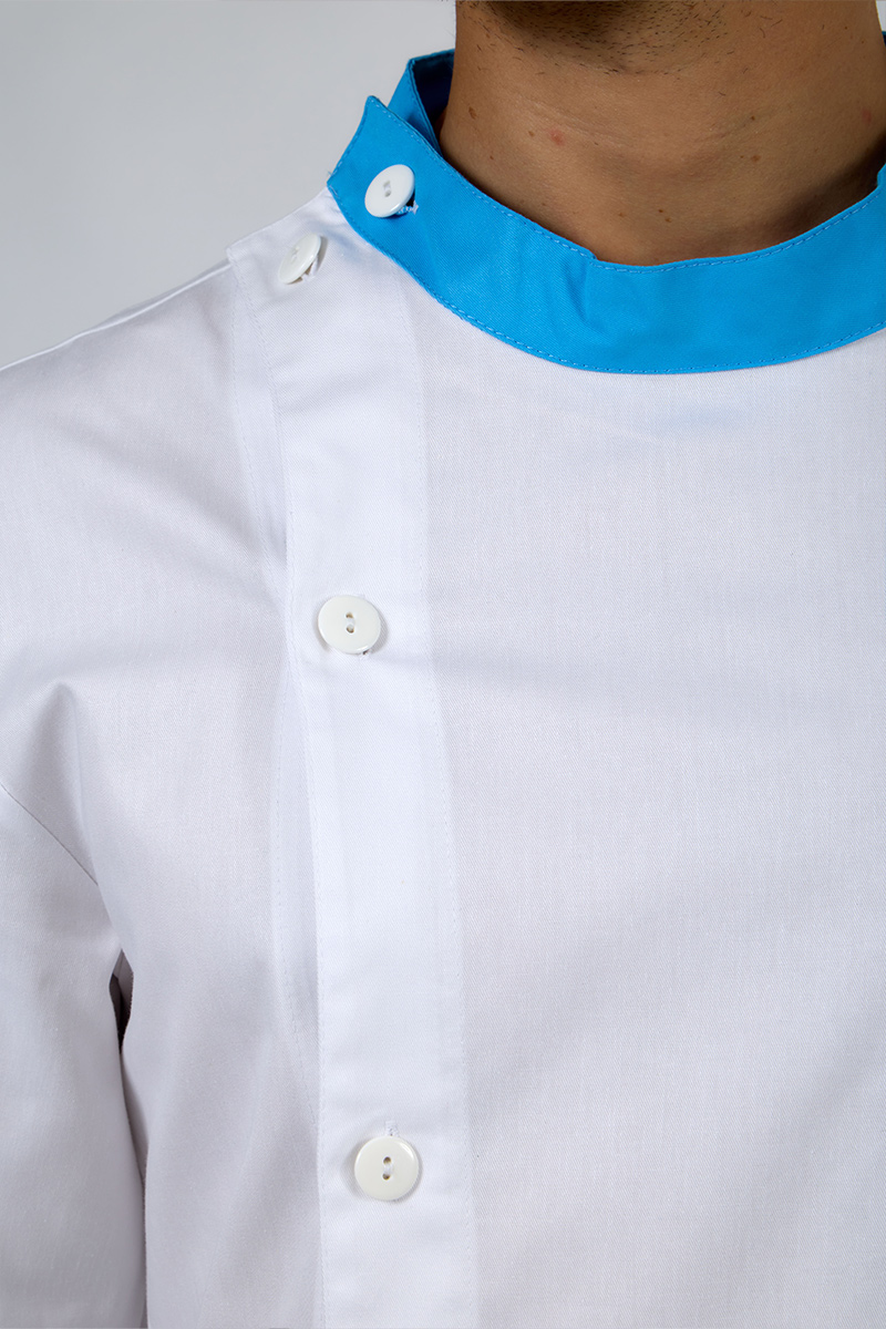 Il collo alla coreana conferisce un aspetto professionale e contemporaneo, mentre la manica lunga con elastico ai polsi garantisce massima libertà di movimento e comfort anche nei turni più intensi.
