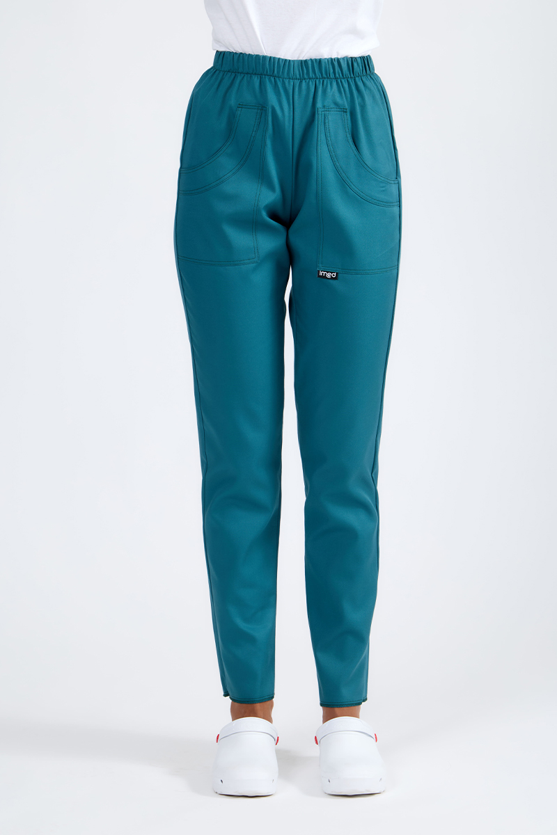 Realizzati in 100% cotone traspirante. Completati con elestico in vita e due tasche applicate sul davanti li rendono ideali per infermieri, medici, operatori sanitari e professionisti del benessere. In questa versione li troviamo colore petrolio.